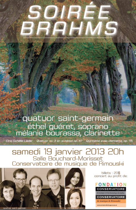 À venir ce samedi, un concert tout Brahms au bénéfit de la fondation du Conservatoire. Dans la compagnie de nos amis la soprano Éthel Gueret et la clarinettiste Mélanie Bourassa, tout les deux aussi professeurs au Conservatoire, nous allons proposer les cinq Ophélie-Lieder dans une transcription de Aribert Reimann, suivi par le troisième quatuor, op. 67. Après l’entracte suit le Quintette op. 115 avec clarinette. Le concert aura lieu à 20h dans la salle Bouchard-Morisset du Conservatoire de musique de Rimouski. Les billets sont disponibles à la porte et au Conservatoire.